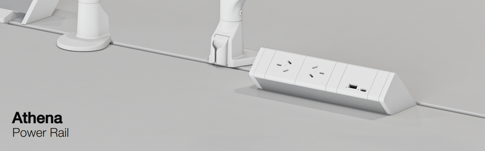 Athena comes with 2 x desk clamps to secure the power rail to back edge of desktop.