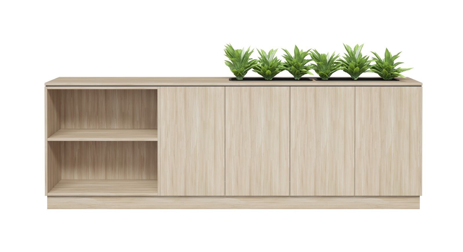 The integrated planter box adds a natural touch, bringing greenery into the office while enhancing the overall aesthetic.