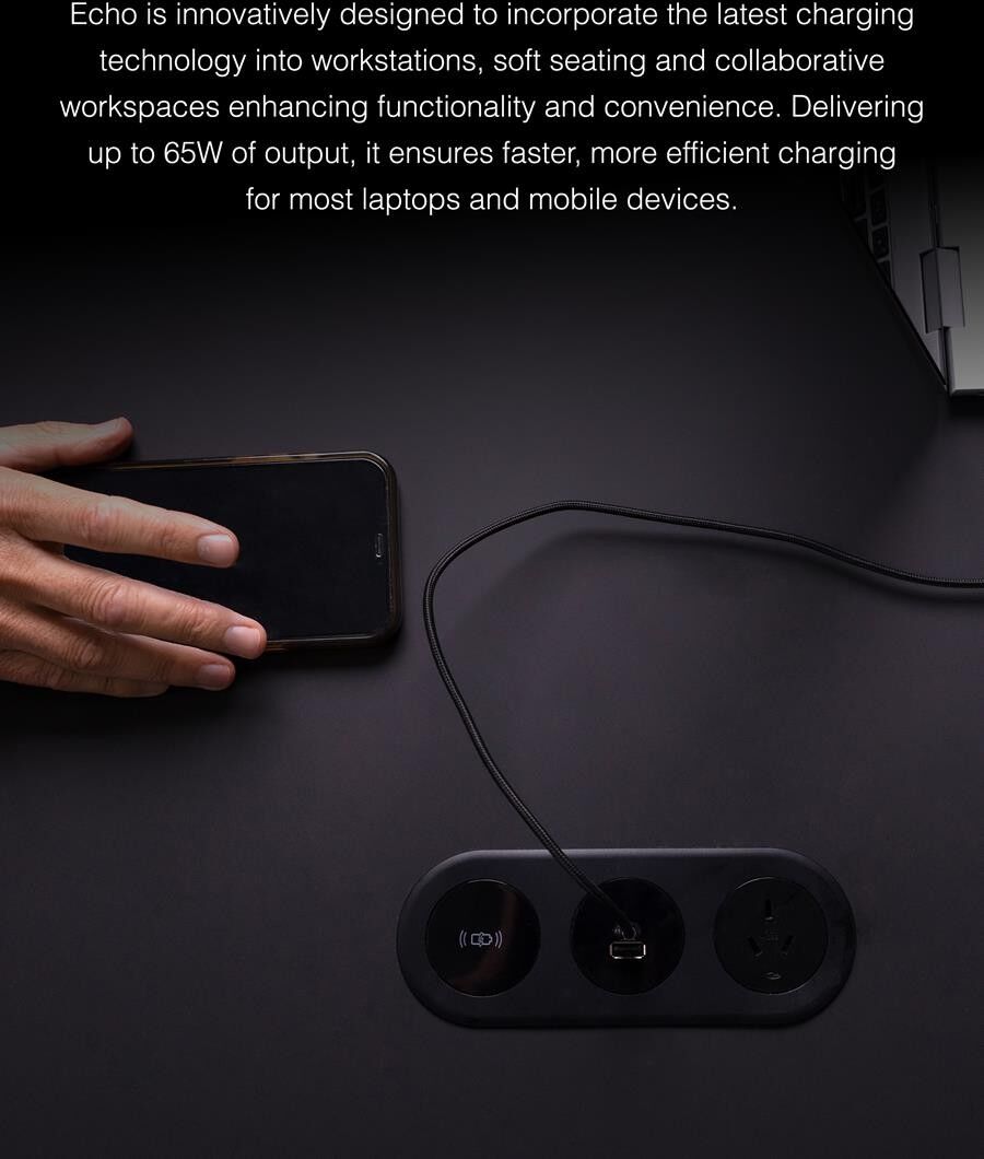 Available in Single, Duo and Trio configurations, Echo offers a combination of Power Outlets, USB Fast Charging and Wireless Charging.