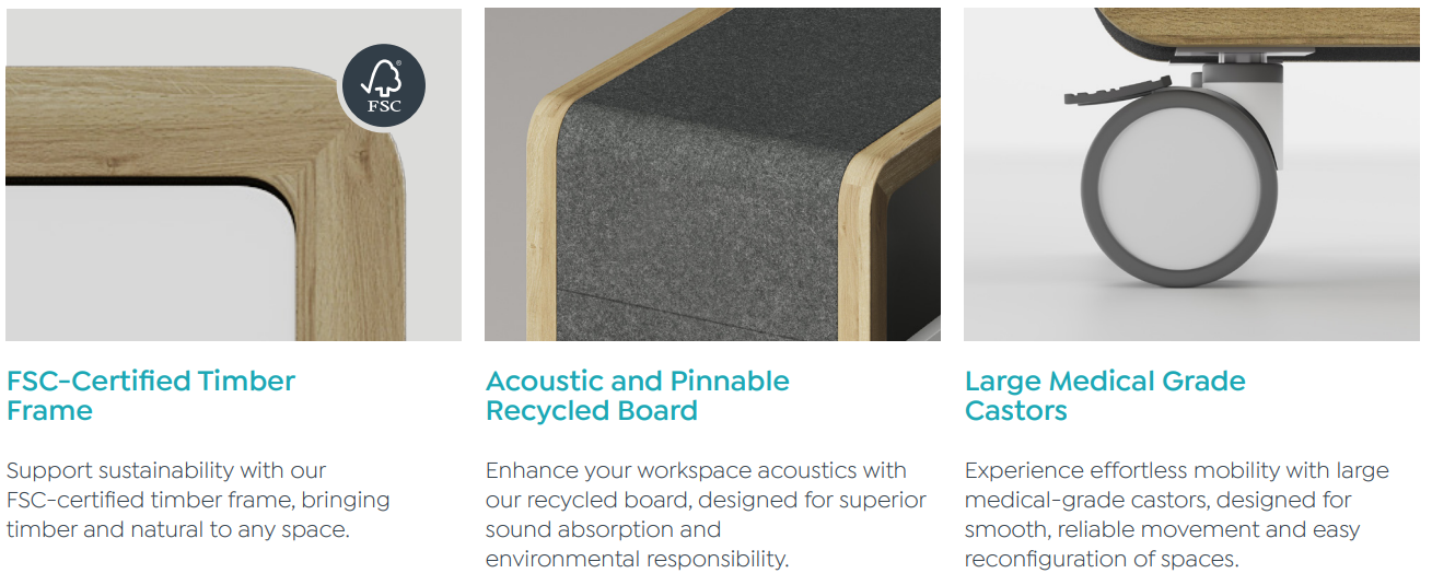 The range is wrapped in acoustic recycled board, boasting a high NRC rating of 0.35, with curved corners and a standard charcoal hue, customisable from a palette of 35 vibrant colours to match any decor.